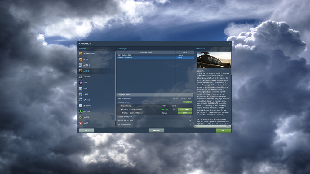 If you want to know how to move forward and after a lot of messing around the fix above will only mess up your log book. Don't copy it or use it. It should not be marked as a solution. But it can help. First, copy your log book and back it back up. I saved a copy to my desktop. In DCS Press SKIP on the M2 in the campaign. Exit DCS Then edit your logbook, delete the skipped line and then set ["result"] = 100 I edited in around the number of kills I did. Here is what my log book looked liked after using SKIP. Using SKIP and then editing was the key for me. Don't copy MINE just use it as an idea to what you have to edit. ["campaign"] = "./Mods/campaigns/AH-64D The Four Horsemen/The Four Horsemen.cmp", ["status"] = "Active", ["history"] = { [1] = { ["datetime"] = "Tue Dec 17 13:29:54 2024", ["aaKills"] = 0, ["agKills"] = 12, ["stage"] = 1, ["deathsCount"] = 0, ["result"] = 100, ["mission"] = "TFH M1.miz", }, -- end of [1] [2] = { ["datetime"] = "Thu Dec 19 18:14:38 2024", ["aaKills"] = 0, ["agKills"] = 35, ["result"] = 100, ["deathsCount"] = 0, ["stage"] = 2, ["mission"] = "TFH M2.miz", }, -- end of [2] [3] = { ["stage"] = 3, ["mission"] = "TFH M3.miz", }, -- end of [3] }, -- end of ["history"] }, -- end of [1] [2] = { -