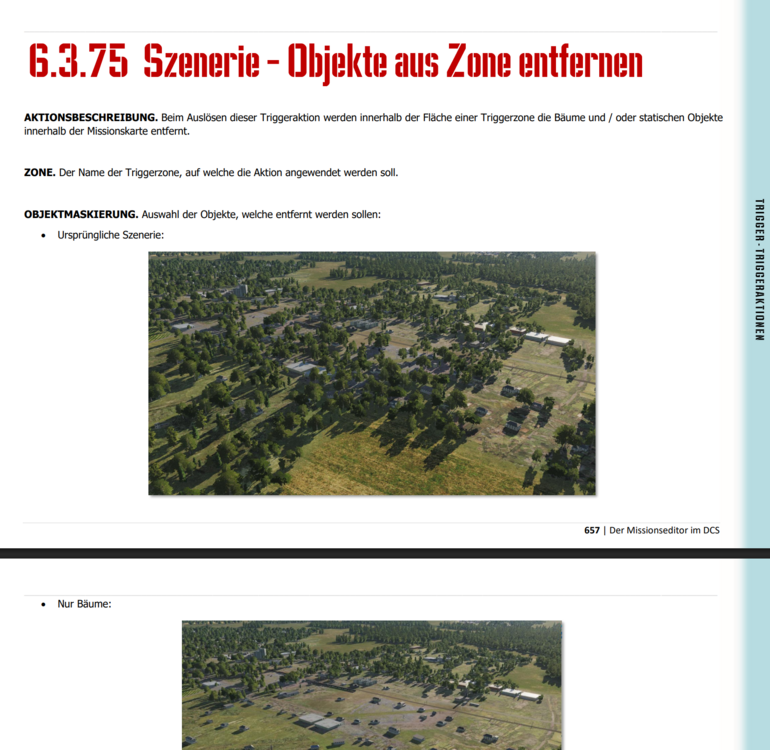 Hall Leute Zum Skripten habe ich eine Frage. In der Beschreibung des Missionseditors, sollte man über den Trigger „Objekte aus einer Zone entfernen“ können Ich habe nun einen Trigger zuerst: „ Missionstar t“ .... eine Triggerregel: „Einheit Viper lebt “ ..... und dann die Triggeraktion: „ Szenerie Objekte aus Zone entfernen (Zone Bäume) .. Obhejktmaskierung Bäume“ Aber da passiert gar nichts! geht das grundsätzlich nicht oder habe ich etwas übersehen ? So steht es im Handbuch, aber wie beschrieben, es funktioniert nicht