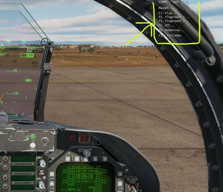 Was ich noch gar nicht gefunden habe, ist die Belegung für das Menü der Funkeinstellungen , über die ich wie bei den Flugzeugen dann oben rechts auf dem Bildschirm die ganze Menüliste der Funk-Meldungen finde, die ich per Tastatur auslösen kann Wie zum Beispiel hier bei der HORNET