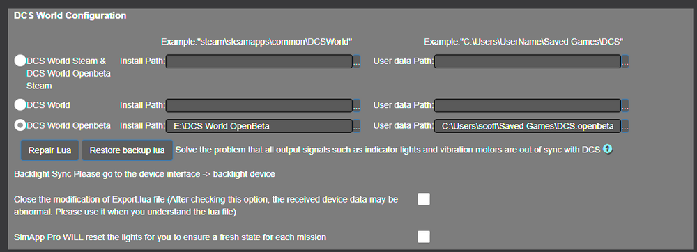 I had to remove & reinstall SimApp three times to get the vibrations working. I was playing with all the settings every time, so it's possible I only got the settings correct on the third try. As Zeufman mentioned, launch SimApp, then hit the cogwheel in the upper right next to the logout button. You want to make sure you have the correct version of DCS selected, with the correct folders set. Can't tell you which to select, since it'll depend on your setup. Here's mine, but I have DCS OpenBeta installed by itself on a separate drive: