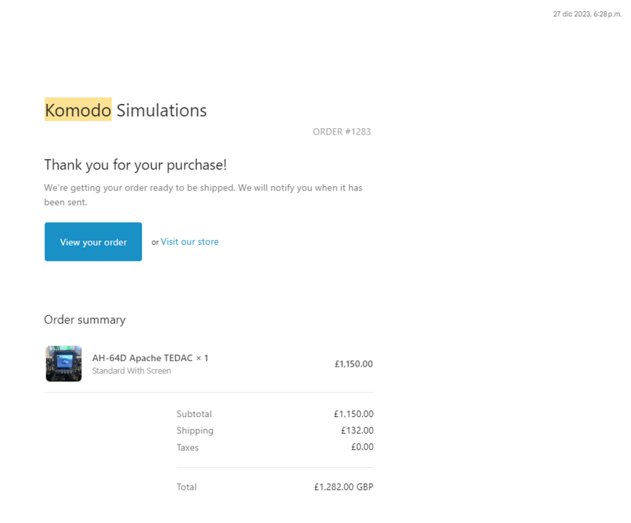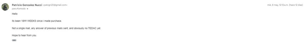 I bought a Komodo Simulations TEDAC on 27Dec23 It said it was supposed to have a 12-16 week delivery time. I actually think its a lot, but since it looked really nice and there were no TEDACs available in the market, I decided to go with it. null25Jan24 i received a mail which i considered a bad joke, telling me as good news that i payed 1.150GBP for a unit that now costed 895. I asked if they were going to compensate for that in some way. No answer from them. After waiting for more than 2 months without any sign of life from the shop, i decided to send them an email, obviously without any reply, 2 weeks from now. Awful customer support. While checking on the website to gather some aditional info to write this as accurate as possible, i see that they extended the delivery time to 12-20 weeks, but anyway they are already late, almost reaching 22 weeks from the date of purchase. You can have some delay in your shippings. What i cannot understand is that you don't inform your customers, specially those that payed a huge amount of money for something. No update on the purchase, no answering mails. I won't buy from them again in my life, and i hope you don't also. I just hope to get my money back. null