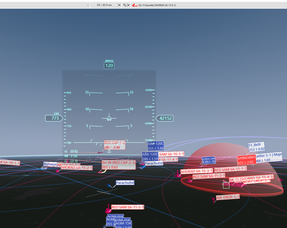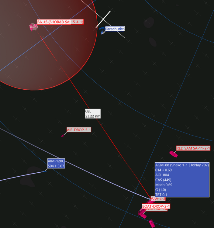 Ahh thank you. I did a search to see if this was already discussed, but I didn't find any hits. Hopefully it gets addressed. Edit/Add: Just to further contribute to this, here's a HUD view from the HARM the moment before it veered onto the incorrect target. The intended target is the pink grouping directly below the HUD (you can see the JSOWs inbound), and the green box to the right is the SA-15 that the HARM veered on to. In the top middle of the image the distance is reading 38.72 nm to that incorrect SA-15 target. -