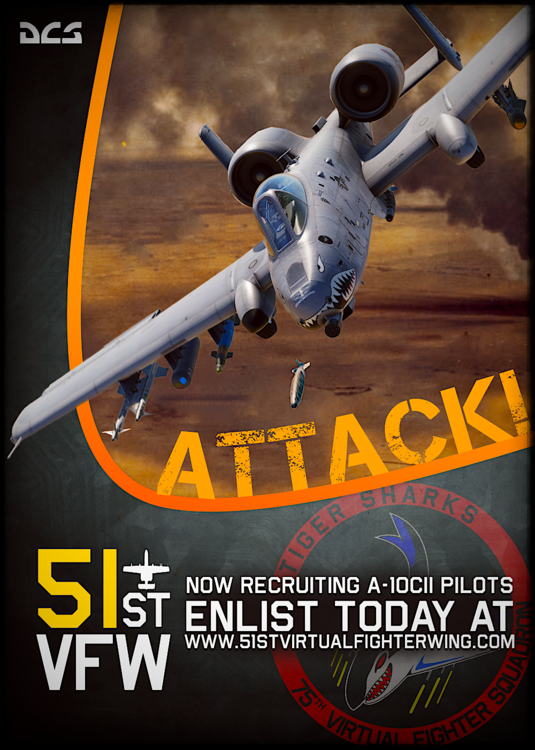 ≡☆≡ JOIN THE 51st VFW ≡☆≡ ■ABOUT US■ We are a North American based group operating primarily in the evening hours between the PST-EST time zones, but we accept applicants from all over the world as long as they can adapt to our schedule. We currently have 70+ active pilots, some active/former military, some commercial aviators, and others just sim pilot gamers. We consider ourselves MilSim-Lite. We do have a rank structure, but do not enforce anything too extreme like virtual saluting or adhering to strict chains of command. We are self aware, and know that at the end of the day we are all just nerds who enjoy the same video game. In the air, we do try to fly seriously. Learning about, and adopting, real world standard operating procedures and tactics is one of the things we enjoy. Our main wing missions usually occur on Saturday or Sunday evenings. We typically have 40+ pilots in attendance, flying a variety of airframe types all assigned with parallel objectives that work toward a larger win condition. We primarily play PVE, but will occasionally organize PVP events, complete with OPSEC channels, encrypted COMMS, and back end espionage. ■SERVERS■ We have several dedicated servers, enhanced with MOOSE, Tactical Paddles, and other back end goodies that bring the simulator to life and enhance immersion. ■REQUIREMENTS■ Fluent in English. Availability in the evening hours of North American time zones. Over 18 years old. Have some form of HOTAS. Have some form of head tracking. Latest version of DCS Open Beta. Simple Radio / SRS. Not an active member of any other 4th gen DCS virtual squadrons. ■AIRFRAMES■ A-10C AH-64D, and/or other Blue helos F-16C F/A-18C F-15E AV-8B (Decommissioned, but we would love to see the Harrier in our skies again. If you are an experienced Harrier pilot interested in starting a squadron under the 51st VFW banner, or if you are part of an established Harrier group looking for a home, we would love to hear from you.) RedFor (We don't have an official RedFor unit yet, but we are collecting lone wolf mercenaries who are interested in participating in our occasional PVP scenarios.) ■FAQs■ Question: Are you a zero to hero training group? Answer: Not quite. Some skills in DCS can be practiced in single player, such as take offs, landings, aerial refueling, basic avionics, navigation, and weapon usage. We hope that any 51st VFW applicants have those types of single player skills mostly squared away with reasonable competency. Everything else that involves other human players, such as tactics, 51st VFW standard operating procedures, and COMMs/brevity, can all be taught in a zero to hero style. TL;DR, just know your aircraft, and we'll teach you how to be part of our team. ARE YOU READY TO TAKE ON THE NEXT CHALLENGE? ■APPLY■ https://discord.gg/51stvfw ■WATCH■
