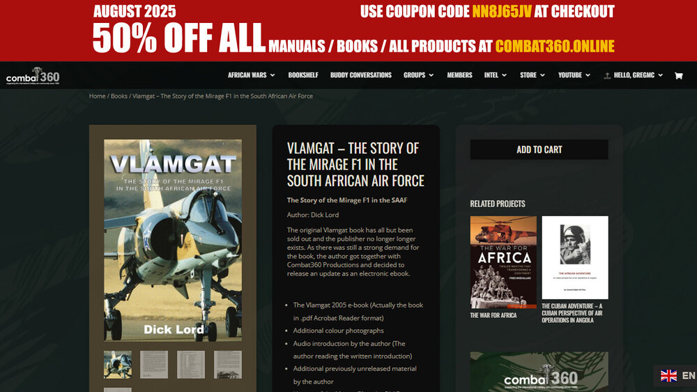 Hi All - I am offering you a 20% Discount till Jul 31 on any of the following - use coupon code NN8J65JV The Story of the Mirage F1 in the SAAF https://combat360.online/product/vlamgat-the-story-of-the-mirage-f1-in-the-south-african-air-force/ Author: Dick Lord The original Vlamgat book has all but been sold out and the publisher no longer longer exists. As there was still a strong demand for the book, the author got together with Combat360 Productions and decided to release an update as an electronic ebook. The Vlamgat 2005 e-book (Actually the book in .pdf Acrobat Reader format) Additional colour photographs Audio introduction by the author (The author reading the written introduction) Additional previously unreleased material by the author History of the Mirage F1 in the SAAF Over 90 extra pages written by General Rafael de Pino, commander of the Cuban Air Force in Angola during the conflict about the (early) days in Angola. Cuban pilot lists 430 pages Mirage F1AZ NWS – Part 1 and 2 https://combat360.online/product/mirage-f1az-nws-part-1-and-2/ Mirage F1AZ FM-1 FLIGHT MANUAL https://combat360.online/product/mirage-f1az-flight-manual-fm-1/ MIRAGE F1AZ FM-2 FLIGHT MANUAL https://combat360.online/product/mirage-f1az-fm-2-flight-manual/ Mirage F1 Cyrano IV Radar Manual https://combat360.online/product/mirage-f1-cyrano-iv-radar-manual/ Main Differences between Mirage F1CZ and Mirgae F1AZ https://combat360.online/product/main-differences-between-mirage-f1cz-and-mirgae-f1az/