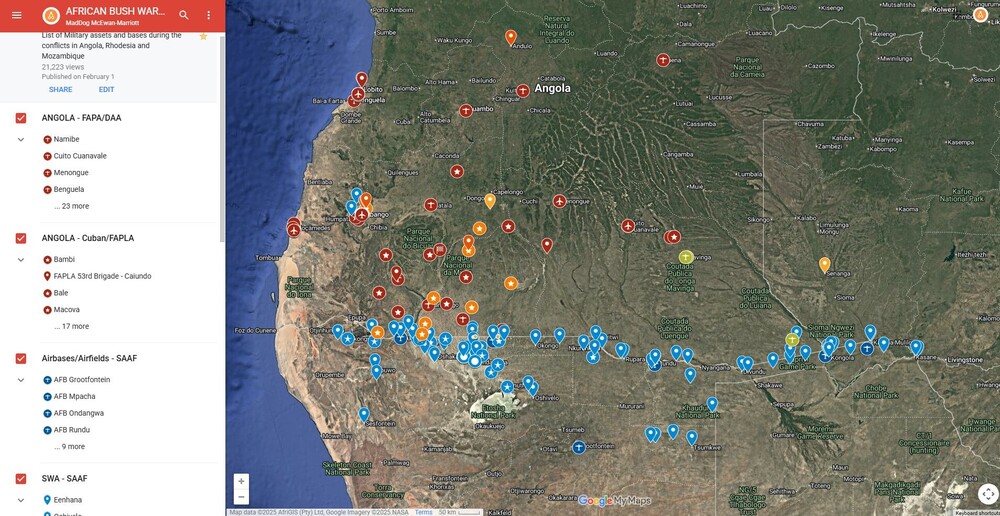 List of Military assets and bases during the conflicts in Angola, Rhodesia and Mozambique https://www.google.com/maps/d/u/0/viewer?mid=1FTZRYWTofj0FFufsgypuzPlauSuw3IOo&femb=1&ll=-15.810174298414127%2C18.88341560625002&z=7 -