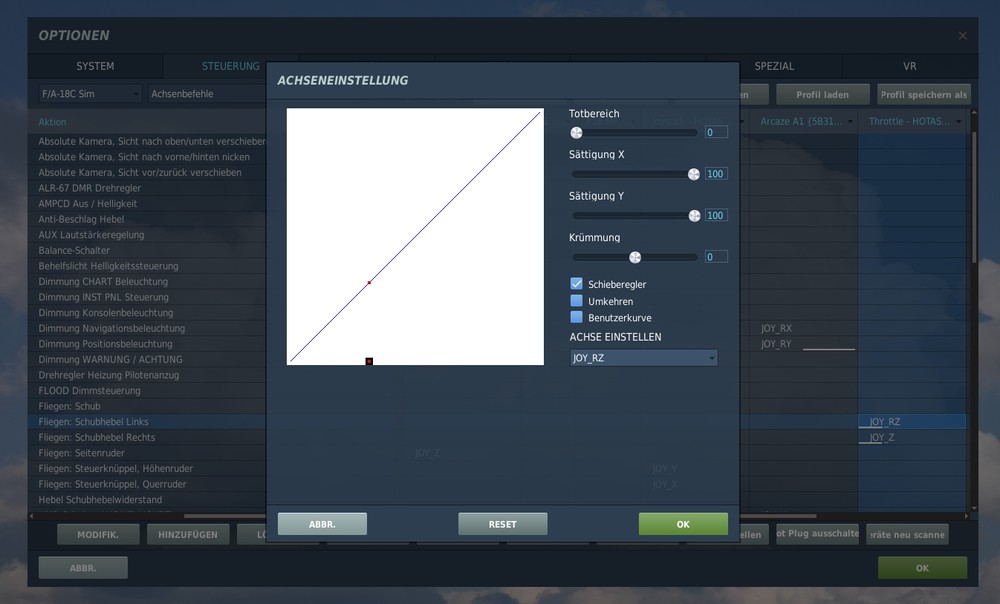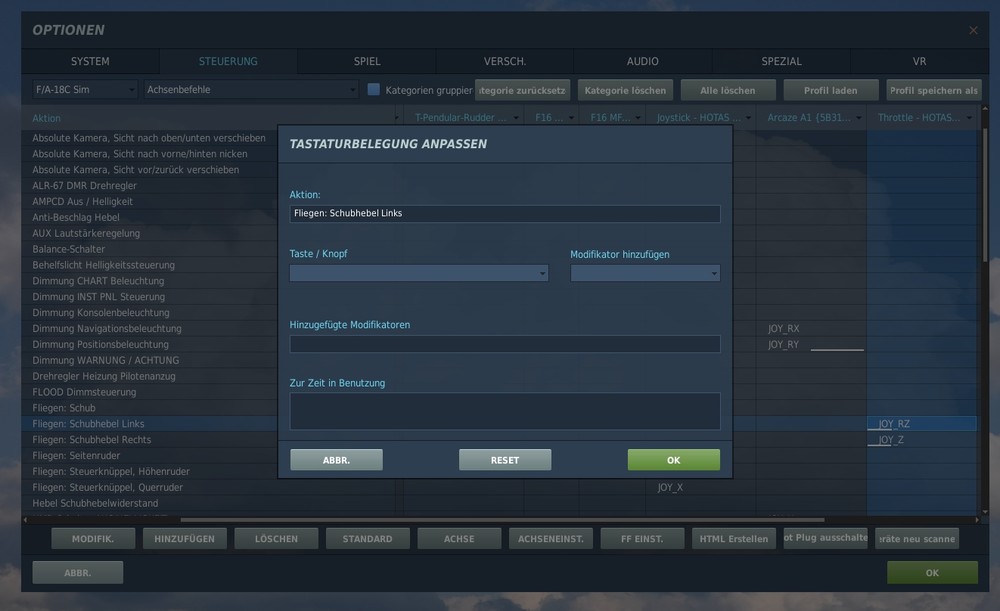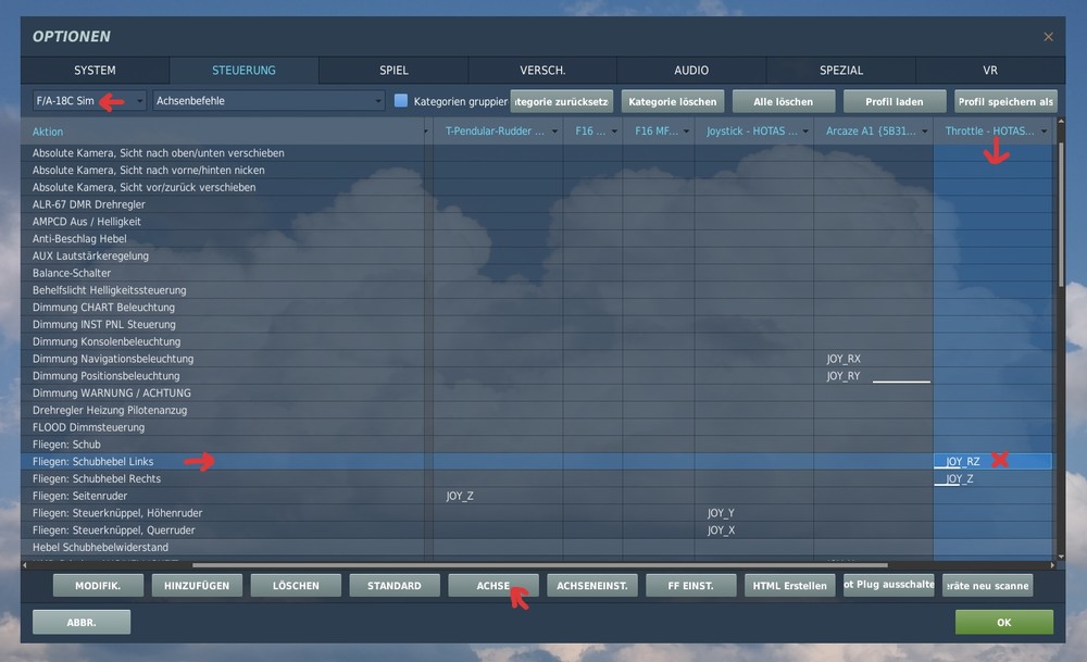 Damit musst du dich auf jeden Fall beschäftigen, da öfter mal analoge Achsen doppelt belegt sind. Ist aber ganz einfach. 1. Oben links kannst du dein Flugmuster auswählen 2. auf "Achse" klicken (jetzt hast du nur die analogen Achsen) 3. jetzt musst du "Schubhebel links/rechts" suchen (die Bezeichnung kann von Modul zu Modul variieren) 4. Jetzt in der Spalte von deinem Schubregler den passenden Punkt doppelt anklicken. 5. Jetzt öffnet sich dieses Menü. Jetzt musst du nur deine passende Achse bewegen. 6. unter Achseinstellung kannst du jetzt noch spezielle Einstellungen vornehmen, wie z. B. Achsumkehr, oder Kurven. 7. Immer auf Doppelbelegung prüfen. Es ist nicht selten bei mir, dass bei einem neuen Modul z. B. das Querruder auf mehreren Geräten hängt. 8. Hier oben kannst du auf die digitalen Knöpf umschalten und einstellen. Das ist aber das gleiche Prinzip 9. Ich lege mir immer eine Sicherungskopie von "...\SavedGames\DCS\Config\" an