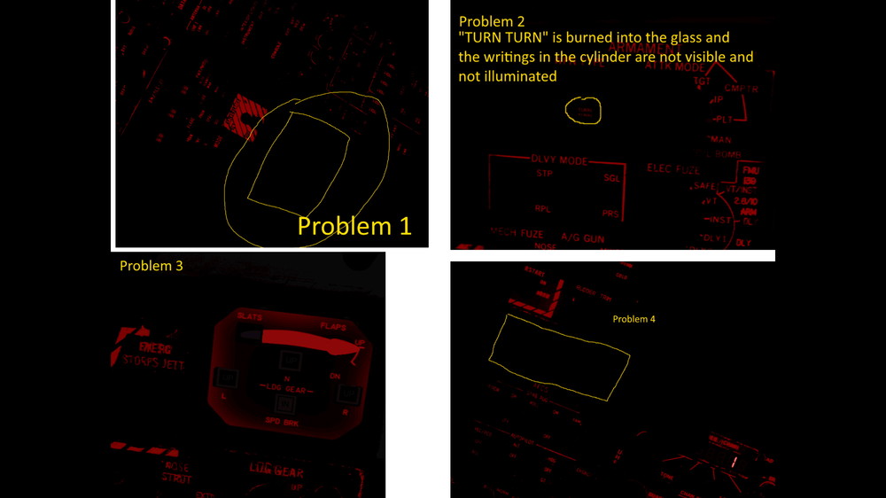 POSSIBLE TEXTURE BUG (backlighting/alpha channel) Hi, first of all, awesome job! Pity the cockpit is hardly readable, so I made F-14 VUX mod to help us with a less-than-eagle's-eyesight! ( https://www.digitalcombatsimulator.com/en/files/3313661/ ) . While modding, I worked with alpha channel to allow for red backlight to illuminate writings and other details, but I found out the following problems originating from the original textures (see referenced pictures) PROBLEM 1 (RIO): No backlight in the AN/ALE-39 lower panel. ***FIXED*** PROBLEM 2 (RIO): In the weapon type window at night, there is an illuminated "TURN TURN" written on the glass while the writings on the rotating cylinder are not lit and not visible (they are with the flashlight). PROBLEM 3 (Pilot): In the FLAPS/SLATS/WHEELS/AIRBRAKES indicator, the dollseyes are not illuminated and hardly visible at night (they are with the flashlight). It is as if the glass is too thick and darkened and makes them hazy. PROBLEM 4 (Pilot): No backlighting for the ENG MODE / ASYM LIMITER panel. I understand that maybe 1 and 4 are not bugs if the real Tomcat is made that way... but how could I have alpha channel "recognized" for those textures? Thanks, keep up the awesomeness!!!