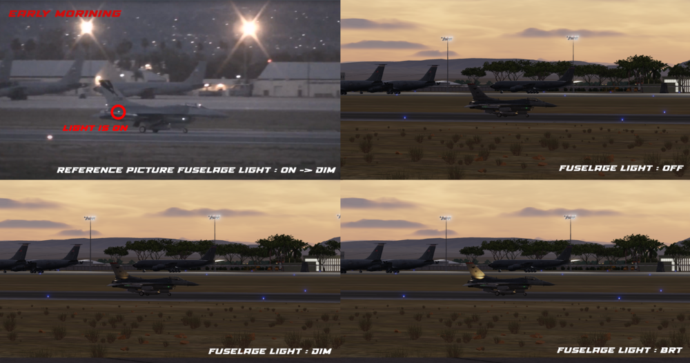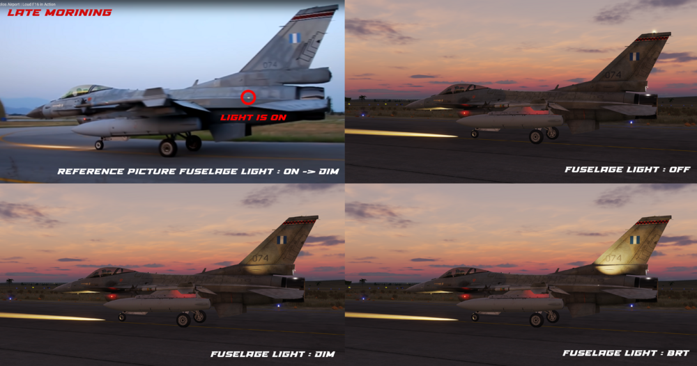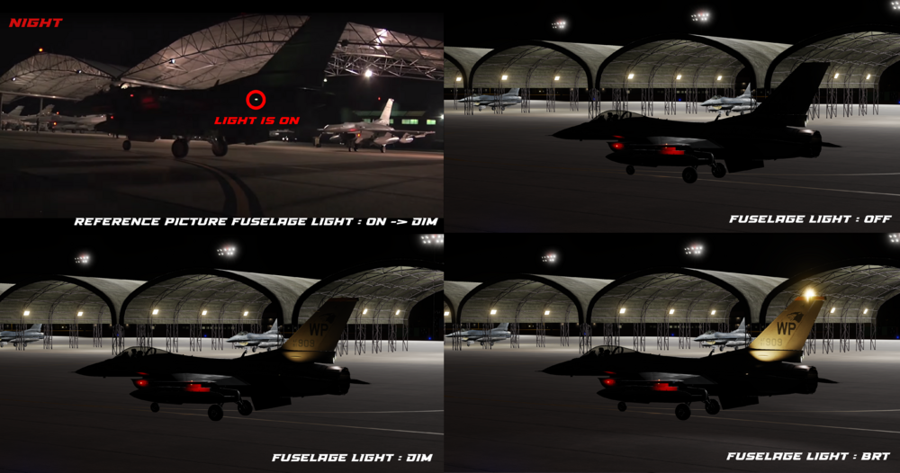 Hi Viper Pilots, According to video's, picture's and a BAF mecanic, the fuselage light in "DIM" mode is too bright in DCS, compared to real life whether by day or night. You will find attached to this message three comparisons in different lightning environments between reference pictures and DCS Fuselage light OFF, DIM and BRT. IRL by day, it's realy hard to know if the fuselage light is "OFF" or "DIM" just by looking at the vertical stabiliser lightning. The best hint to find if it is on or off is to check the fuselage light bulb state. Whether morning or day light, the vertical stabilizer is not illuminated at all with the fuslage light in "DIM" mode, however in "BRT" it is well illuminated. IRL by night it's realy realy hard to notice, it s just like a very faint/dim glow that illuminates the vertical stabilzer, not a spotlight. IN DCS 2.8 : it is realy easy to identify when it's OFF or DIM because the "DIM" lights up too brightly. Conclusion : The "DIM" fuselage light must be reduced so that we can't see it during the day, and at night it must be adjusted to give a very faint glow to the VS. About the "BRT" mode, it's already all good. Note: screenshots have been captured on DCS 2.8.6.41066.1 without any editing or shaders applied. Thanks for the reading, best regards Wolf. You'll find links to videos and website sources below : USAF - Early morning :https://youtu.be/z3uS65hDl-0?t=18 HAF - Late morning : https://youtu.be/aebLmMiF2DU?t=25 USAF - Night : https://youtu.be/PRLChQFbU1E?t=41 RNLAF - Night : https://www.runway28.nl/2017_11_30_EHVK_EN.php
