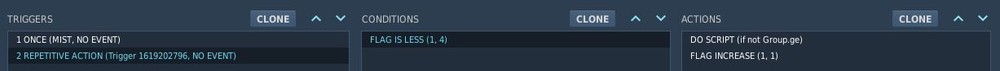 I'm trying to create a trigger that respawns a bad guy group 3 times only. I'm using a simple respawn a group if dead MIST script along with flag values. I attached a screenshot. I can't understand why this is not working. Help!