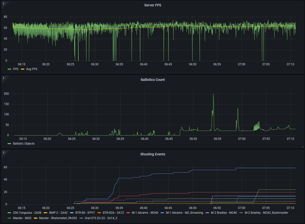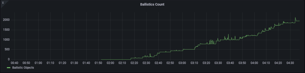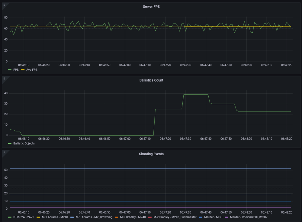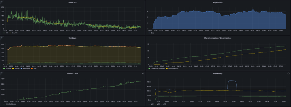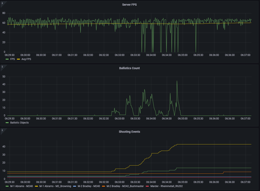 21. Summary: DCS World is creating invalid ballistics objects which are not cleaned up. These ballistics objects persist until mission restart and have a significant impact on the performance of Multiplayer servers, measured in "Server FPS" or the number of simulation frames per second that the server is processing. Background: Ballistics objects are spawned whenever a rapid fire weapon starts firing. They may also be spawned when cluster munitions are dispensed but I have been unable to confirm that. Ballistics Objects tend to have an impact on Server FPS which depends on the power of the server, the number of objects and, apparently, the number of connected clients. This is because the server has to spend time calculating the trajectories and other properties (Collisions etc.) of these ballistic objects. Here is an example of Ballistics Objects being spawned when rapid-fire weapons fire. You can see that the number of Ballistics objects in the mission spike when a shooting event starts and the resulting impact on server FPS. You can also see that the number drops back to 0 as the ballistics objects expire. (Note: The below graphs come from a liberation mission running with only AI running on a home-server) Bug: There are times, however, when Ballistics objects increase without an associated shooting event (Or any other event that I can find). You can also see that after this jump the objects are not cleaned up and the number of ballistics objects in-mission steadily accumulates. If we look at these objects we can see that they are invalid and they are always identical aside from the main ID. Their type is all 0, their coordinates are all 0 and the lat/lon is always at map origin, the country is 99 which is not in the country enum. Clearly these are not something that should exist. "33584385": { "Pitch": 0, "Type": { "level3": 0, "level1": 0, "level4": 0, "level2": 0 }, "Country": 99, "Coalition": "Enemies", "Flags": { "Jamming": false, "IRJamming": false, "Born": false, "Static": false, "Invisible": false, "Human": false, "AI_ON": true, "RadarActive": false }, "Name": "", "Position": { "y": 0, "x": 0, "z": 0 }, "Heading": 6.2831854820251, "LatLongAlt": { "Long": 34.265515188456, "Lat": 45.129497060329, "Alt": 0 }, "CoalitionID": 0, "Bank": 0 } I have also noticed that these invalid objects tend to (but not always) spawn 76 objects at a time as evidenced below (Note: This graph is from a Hoggit Georgia At War session). The trackfile for this Liberation mission can be found in the attached `liberation-mission.trk` which is tiny because, I assume, there is only AI. Impact: The accumulation of these Ballistics Objects has a deleterious impact on the Hoggit multiplayer servers (And potentially others, but Hoggit is what I was analysing) due to the fact that the server still has to assign time to process them even though they are doing nothing. Here is a graph of a typical mission on Hoggit Georgia At War. You can see that the server FPS steadily decreases as the number of Ballistics objects increases. I could find no other metrics that shows such a correlation. You can also see that the number of players also has an impact on the server FPS in that the FPS recovers very slightly as player count drops at the end. I am not sure if the number of players amplifies the impact of the ballistics objects but my assumption is yes because on a server with very few players the impact is not as great. (Note: The below graphs come from the Hoggit "Georgia At War" server) As well as a corresponding increase in CPU usage: You can see here that the number of invalid Ballistics objects is in the thousands. However I have also observed that this depends on which of the two missions that make up "Georgia At War" is running (P1 or P2). In one mission the Invalid ballistics objects consistently numbers in the hundreds and one in the thousands. However even just a few hundred ballistics objects has a massive impact as well. I have observed this behaviour across about 20 different mission sessions. Track files for some GAW sessions with this ballistic object accumulation can be found here: https://drive.google.com/drive/folders/1-_Ae-h6dl5s2k9v1FWwfkME0OBOflbWt (Size warning. 300-400MB) Request: Eagle Dynamics to find the root cause for these invalid ballistics objects being spawned and fix it. liberation-mission.trk