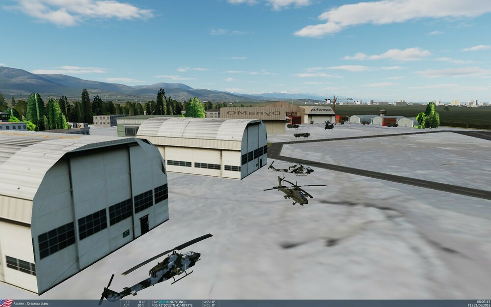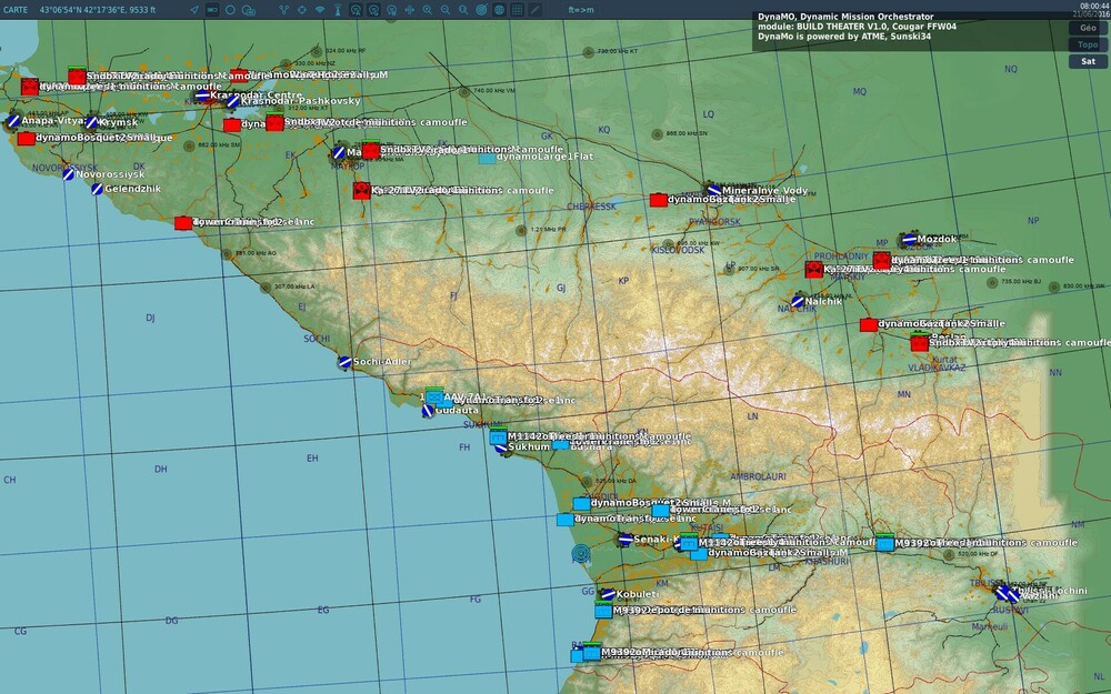 Hi everyone, Short update today. The Caucasus Demonstration Theater is slowly but surely taking shape. Some thirty platforms (nuclear plant, power plant, factory, army base) are already in place, as shown by the icons in the following image. The units automatically placed on the platforms are obviously in line with the platform's coalition. For example, you can see that Russian helicopters (Ka50, Mi8, etc.) are placed on the red army bases, whereas NATO equipments (Ah64, etc.) are placed on the blue army bases (although everything was mixed on the Generic platform). Of course, every platform is different. Above the Kobuleti Army base. I remind you that this scenario is purely fictitious, so there's no need to look for this base in real life (although of course there's nothing to stop you setting up platforms in line with reality). Vehicles and helicopters are just static object but I am now coding the bataillon that will effectively defend the platforms. See you soon for new pictures (and video) Happy flying -