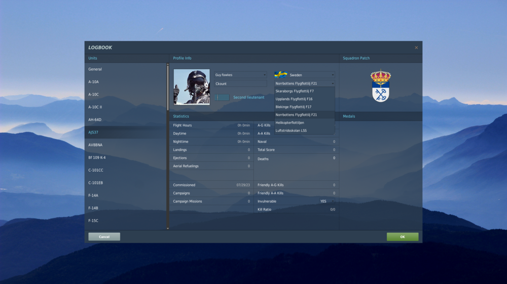 nullNote. All edits are done manually as I don't know how to make a JSGME mod of the changes. Make sure to backup original files and keep a backup of the edited file as they will probably be restored with updates/patches. Add attached Sweden.lua to Drive:\Eagle Dynamics\DCS World\Scripts\Database\Troops\ troops = { troop('Skaraborgs Flygflottilj F7', _('Skaraborgs Flygflottilj F7'), 'f7flj.png'), troop('Upplands Flygflottilj F16', _('Upplands Flygflottilj F16'), 'f16flj.png'), troop('Blekinge Flygflottilj F17', _('Blekinge Flygflottilj F17'), 'f17flj.png'), troop('Norrbottens Flygflottilj F21', _('Norrbottens Flygflottilj F21'), 'f21flj.png'), troop('Helikopterflottiljen', _('Helikopterflottiljen'), 'hkpflj.png'), troop('Luftstridsskolan LSS', _('Luftstridsskolan LSS'), 'lssflj.png'), }; Add unzipped png's to Drive:\Eagle Dynamics\DCS World\MissionEditor\data\images\Countries\Sweden\Troops Replace db_countries.lua in Drive:\Eagle Dynamics\DCS World\Scripts\Database or in db_countries.lua, replace country:add('SWEDEN', _("Sweden"), "Sweden" , "SWE", use_default_ranks, no_awards, no_squadrons); with country:add('SWEDEN', _("Sweden"), "Sweden" , "SWE", use_default_ranks, no_awards, 'Sweden.lua'); Sweden.lua Troops.zip db_countries.lua