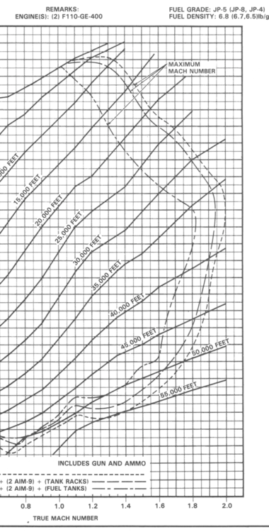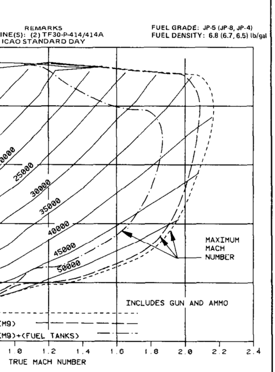 Keep in mind that right-most line is with 8 missiles and 8000 lbs of gas, so clean max speed will be a little higher. Also note that neither aircraft comes close to 2.4 according to flight test. Kinda skeptical that removing the missiles would result in a 0.25 mach speed increase ("2.4" clean vs 2.15 with 4x4 loadout), that's a lot of extra drag at those speeds.