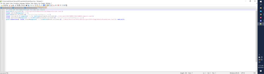Hello, I have a Stream Deck XL. I've downloaded the ctytler interface, inserted DCS-Export and Bailey Scripts and BarRaider Macro's. The Stream Deck appears to work. The profiles open correctly on the deck. I have no comms with DCS. I changed to 1725 as per CTylers video. I also placed the Export.Script at the top of the Export.lua, but it always changes. See screen shot below That "local wwtlfs=......." always goes to the top. I think that script is part of a WinWing script. I've tried the Run as Admin on everything, then on nothing. Stream Deck software 5.2.1.15025 SD Firmware 1.00.012 Latest DCS. My Eagle Dynamics is on D:, of course the users/saved games/..... is on C:. Stream Deck on C:, I was told none of this matters. Can't think of anything else. I appreciate the help.