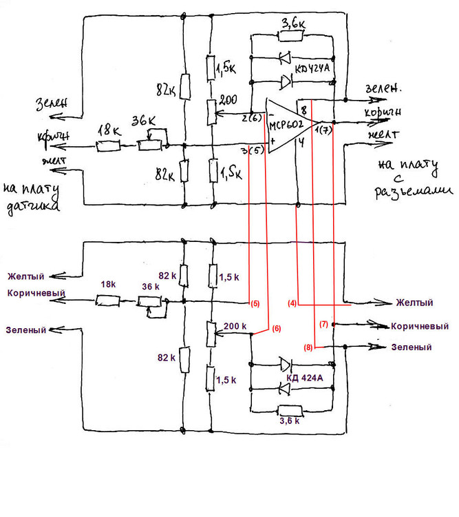 Итак, вот электрическая схема Gogoblina для устранения проблем чувствительности и как следствие, нелинейности в Х52. Спецификация: Резисторы подстроечные: 3224W-1-201E 11об. подстр.рез.200 Ом 2шт 3224W-1-503E 11об. подстр.рез. 50 K 2шт Резисторы постоянные: С1-4 0.125/0.25 вт, 5%, 18 К 2шт С1-4 0.125/0.25 вт, 5%, 82 К 4шт С1-4 0.125/0.25 вт, 5%, 1.5 К 4шт С1-4 0.125/0.25 вт, 5%, 3.6 К 2шт Диоды: КД 424 А 4шт Операционный усилитель: MCP602-I/P DIP8, 2.8MHz, 2.7-5.5V, 2 chan.,Ind 1шт Панелька для микросхемы: TRS- 8 DIP панель 8 конт. цанговая 1шт Макетная плата: ECS1/2 Макетная плата100х80мм 1шт Монтажный провод (1 метр) Провод НВ-4 0.12 кв.мм