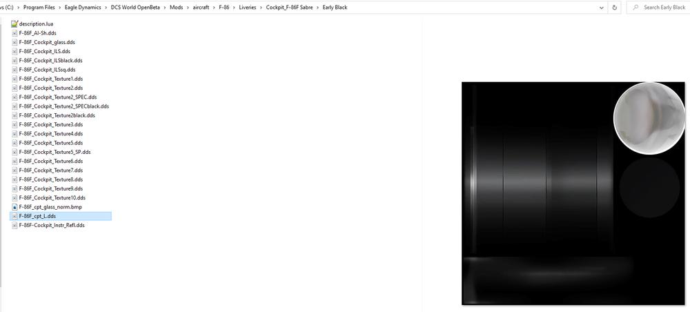 Hi guys, I've been messing around with the cockpit textures after installing the Early Black cockpit mod yesterday. Out of the box, the glass in the black mod looks better to me than stock, since it doesn't reflect as much of the lens and greasy glare that makes sniping bandits in vertical, near zero g, AI hammer head defensive climbs more difficult. So far I have found several textures and one in particular may have the most impact. But getting them to load in game is still a challenge since I'm not very experienced with creating texture mods in DCS. Here are the texture files I think are involved: C:\Program Files\Eagle Dynamics\DCS World OpenBeta\Mods\aircraft\F-86\Liveries\Cockpit_F-86F Sabre F-86F_Cockpit_ILS.dds F-86F_Cockpit_Texture2.dds F-86F_Cockpit_Texture2_SPEC.dds F-86F_cpt_L.dds F-86F_cpt_L_SPEC.dds This last one, cpt_L_SPEC is an alpha channel in one layer (specular). The one before it, cpt_L may be the primary one creating the reflection. It has a base texture AND and alpha, filtering the projector lens image however is designed in the model. I think this is the main method of creating the reflection visible to the pilot. This I would like to minimize as much as possible. I have tried several places to get my modded files to load: 1. In the Early Black mod folder by swapping filenames with stock to tell them apart. 2. In the Early Black mod, in the cockpit folder instead of liveries 3. In my save game folder under the mods/aircraft with a new cockpit folder, in folder or in a zip. I am pretty sure I would need to change some other files like luas and such. Can anyone help or suggest the best place to start? I used to paint and mod a lot in the CFS3, Roman BOB-MiG Alley days and have just gotten back into it. DXTbmp still works! Thanks!