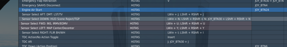 Hi All, The Sensor Select FWD and LEFT in the screenshot below seem to be disabled. This is for the AV8B. No matter what key I map to those the command isn't recognized. The other sensor select positions work fine. I tried clearing, defaulting, reloading the particular commands and the entire keyboard list and can't seem to clear the different shading. I did not find any duplicates either. Does anyone have a suggestion? Thank you very much!