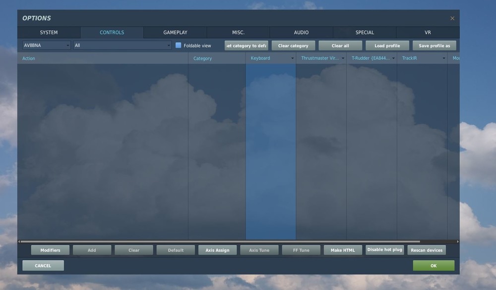 Hi Home Fries, I have an issue with the new AV8B profile. I updated to the latest DCS release and CTS 2.57e. The first time I ran DCS everything was fine. The next time, I could no longer access the Options-Controls page. When I click the controls tab the page is blank and the "OK" and "Cancel" buttons don't function. Clicking to any other settings tab works as normal. I did a fresh CTS install and the first time I ran DCS it worked. The second time I ran DCS the controls tab was disabled again. Controls settings aren't available in mission either, as the sim pauses but no window pops up. I think I tracked it to the AV8B custom keyboard default.lua file. If I use the newest joystick default.lua and an older keyboard default.lua I can access the AV8B control settings pages. When I put the latest keyboard default.lua file back I lose access again. Any thoughts? Thank you!- 2263 replies