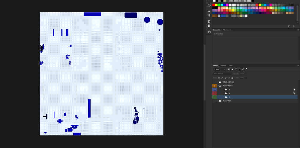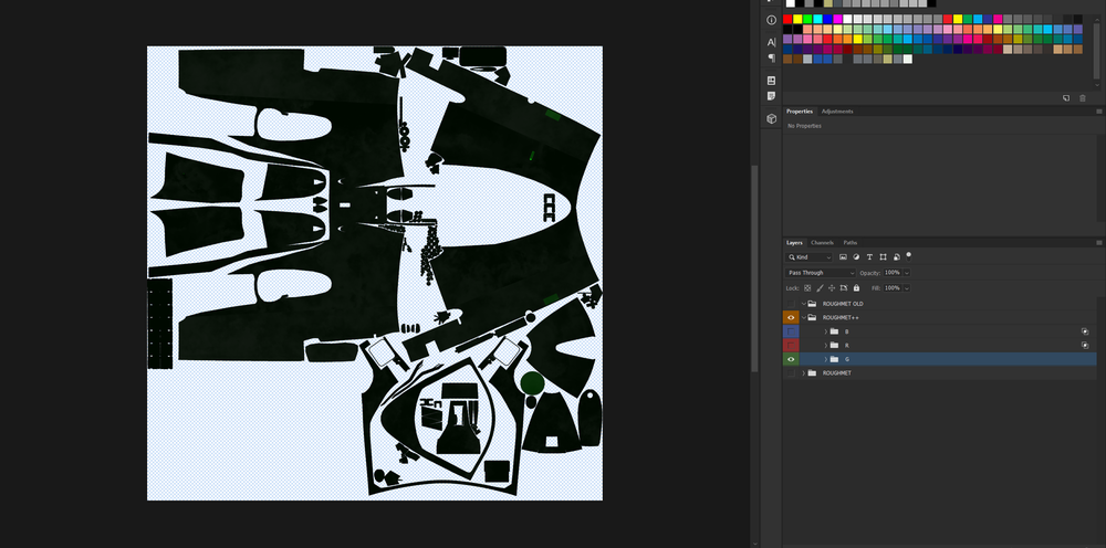 Have you all 3 channels; Red, Green and Blue? Have a look at this Reddit thread which defines the function of each channel A good idea is to create 3 folders in the PSD and change the advanced blending of each to only allow the specific colour channel to pass; one for R, one for G and one for B. Double click on the folder and deselect the necessary channels, as seen on the attached pic. It's also a good idea to copy only the necessary parts from the layers you need for a certain channel i.e. If metallic items are on the same layer as fuselage paint, copy just the metallic parts to a new layer and place that in the B folder, otherwise the fuselage paint will have a metallic value assigned (undesirable unless your livery is bare metal). You can see in the two images what I've placed in the Blue and Green folders as an example. Roughmets can be a real PITA and can sometimes take me longer than the actual painting. Apologies for the bad explanation but if I can help any further feel free to reach out. -