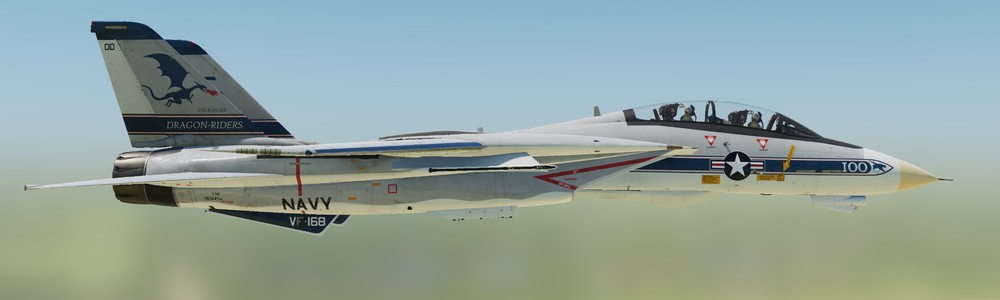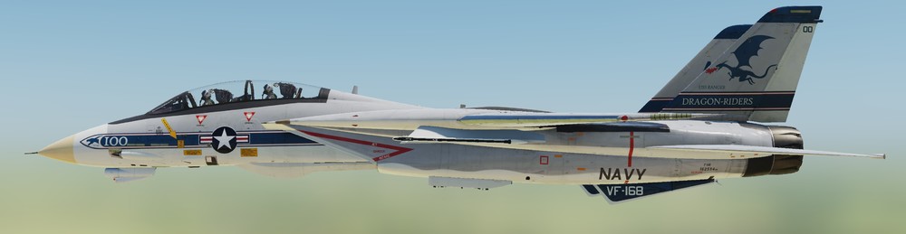 Introducing VF-168 Dragon Riders. This is a fictional skin for the F-14B Tomcat that represents the livery for the Commander Air Group (CAG) jet attached to the USS Ranger (CV-61). The choice of “168” is inspired by the USS Nimitz CVN-68 which I served aboard with the Reactor Propulsion Department. The livery is inspired by VF-1 Wolfpack. Every stencil was created from scratch and my primary point of reference was the incredible Bert Kinzey books, “Colors and Markings of U. S. Navy F-14 Tomcats, Part 1 & 2”, (Digital Colors and Markings Series of books). The multitude of stencils present on the Tomcat is generally close to how Grumman stenciled the Tomcats early in production and this skin is meant to emulate that initial practice. Gradually, according to Kinzey, the number of stencils were reduced in until most Tomcats had very few stencils (beyond the primary stencils). Good luck folks! -