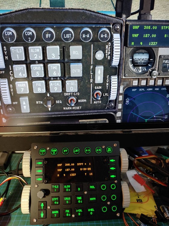 Layout inspired by the F16 Block 60(or 70?) from UAE/Turkey Version. Display is 25664 OLED and common 6x6 LED tactile, panels are laser cut matt acrylic. Buttons/wheels are SLA 3D prints, painted and CNC engraved. At least it can cover F16, FA18, AV8B. and maybe more modules if i have time to code for the OLED display. Also a dedicated DED as a side product, can used for display different data/graph. Likely make it for IFEI(text only) or F14 engine gauges(Graph)? babysitter husband means very slow WIP.....
