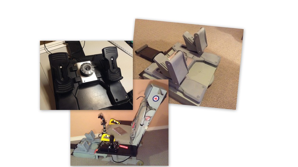I don't like the design of my Saitek pro pedals, however I don't want to spend $ on new Saitek combat pedals... So I came up with a realism on the cheap mod, aka the "Saitek Pro Pedal RoC mod". Some wood dowel, aluminum rail, sheet metal, bits of scrap wood, screws, glue, paint and a few hours in the workshop. The end result are pedals that not only look much more realistic than the stock pro pedals, they are also ergonomically correct for use as aircraft pedals. Here is a before and after pic. Also one with pedals and my seat together: