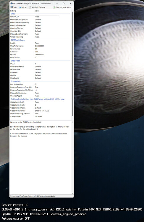 So I set the preset to J in the DLSS tweaker, I copy over files to BIN-MT, but in game, it shows the preset as C. Any ideas? FWIW: When DLSSTweaker asks what to name the file, I chose ngnx.dll this time instead of dxgi.dll Reason being, it was conflicting with reshade. Reshade also use dxgi.dll And boy did I go down a rabbit hole trying to get them to work together. -
