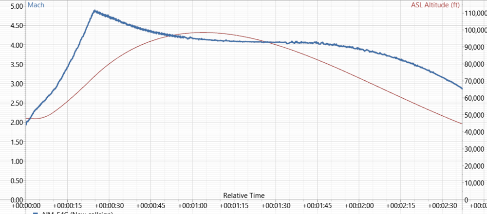 In fairness to the developers, I don't think the missile is “unusable”. But it is kinetically unrealistic if we take into account the mathematical validations, as we have seen the missile even has an amount of fuel incompatible with the current burn time if everything is calculated as Tavarish did. But yes, it is possible to use the missile quite successfully using it within the zone below 25nm against fighters at altitudes from block 2 to block 3. It would be interesting if you could post a video of your shots showing your TID to see if we can help. (If you're using the A version of the missile the chance of it being fooled by the Chaff is enormous, sometimes it even seems a little worse than the AIM-7 I may be wrong because I haven't stopped to look at the AIM-7's resistance data it's just an impression, also check if ACM cover is up because if you fire with the ACM cover up and the target is not in the search cone of the missile's seeker, it will not track. ) Apparently we had two “batteries” of simulations trying to validate the PMHT (Phoenix Missile Hypersonic Testbed) project One of them seems to have been the first where simpler simulations were carried out: And another that seems more complete (which is the one I asked to be reproduced) where more elaborate aerodynamic factors have been studied also this simulation has a altitude chart which is very important for validating the data, because then we know the trajectory that the missile traveled and not just its speed: Not every simulation is definitive, but it is an important parameter for comparison. What happens when I try to reproduce this simulation is that at the missile's peak speed at around 80,000 feet in both cases (in the NASA simulation and in the game reproduction) in the game the missile barely passes Mach 4, while in the NASA simulation the missile both at 80,000 feet during its route is around 4.6/4.7 mach. This reinforces the approach presented by Tavarish that the missile lacks thrust and burn time is wrong also: