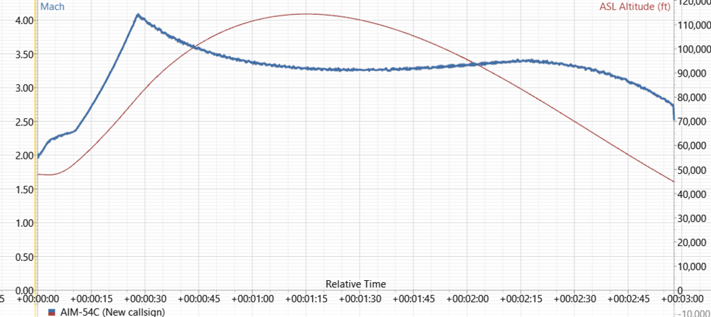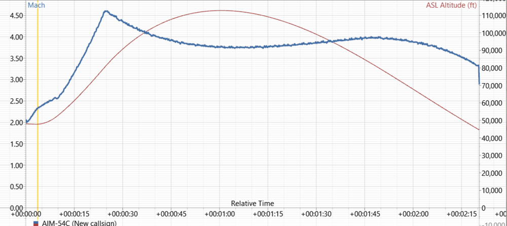 @FWind It's great that you've posted this test again, so that I can point out some differences based on the data you've provided. From my performance chart taken from the game "vanilla" how is it now no modifications made by me, I was able to simulate a shot very similar to the one provided by the NASA study unfortunately I just didn't get the same total flight time because I needed a target to be able to adjust the loft, (with a very similar climb profile as you can see comparing the altitude charts) The missile can barely get above mach 4 while the missile should reach approximately 4.8 mach based on NASA tests. Please take note that this NASA simulation its calculated with 1000lb missile as you can see on "launch condition": Here we have the results from Nasa: Please note that NASA indicates that the missile has a window above mach 4 of 41 seconds, what we have today replicating the same launch is a window of around 2 to 3 seconds. which in my opinion seems to be a very significant “lack” of performance, since all that less speed will interfere with the missile's travel time, leading to various consequences. Now I'm going to present two case studies of my own where I changed the code of the missile and adjusted it according to the thrust of 18318N and burn time of 23.8 sec that @tavarish palkovnikprovided: This first one: I didn't modify the loft profile of the standard used by the missile, even though I still achieved a speed of 4.6 mach, which is much closer to the NASA test: On the second one:, I modified the loft profile so that the missile achieved a higher peak speed of 4.8 mach , which gave me practically identical performance as NASA test, at least in terms of kinetic energy: For these reasons that I presented in my previous posts, plus those that I'm showing here now together with the data provided from NASA test and Tavarish Calculations, I believe that today we have a simulation that tends to be incorrect in some kinectics aspects of the missile. Remembering that at no point do I want to point fingers or say that the work hasn't been done well, but that it can be improved, not only in the fact of the guidance and loft profile as I showed in my tests that just a small adjustment of the standard profile that is currently configured made me gain peak speed in the missile, we are not far away, it is necessary to recognize all the work that Heatblur has done to date, but the fact that they are excellent developers does not exempt them from the fact that at some point they can also make mistakes, just like you and me, we are all human. What I'm looking for is to try to help so that we can have the best possible digital recreation of this iconic airplane.