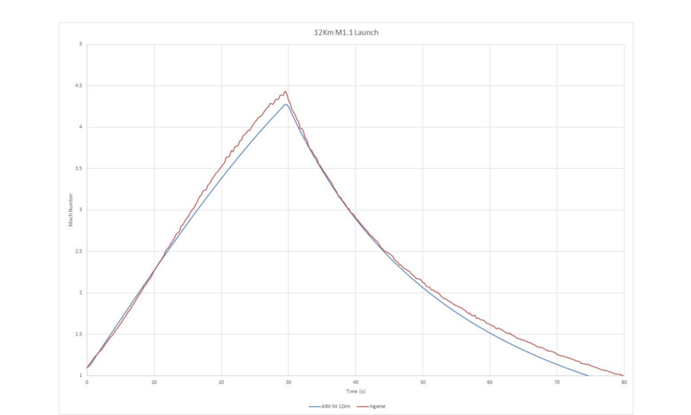 Well, I do believe that there is something wrong with the missile's current state of energy and I don't think that the loft trajectory alone is the main problem (but it is one of them). And no, it's not based on thoughts but on various facts that have been presented here, simulations, reverse engineering of the original blueprint from the engine, calculations, documents etc... The biggest fact that exists is that there is no consistency in the Phoenix information, various sources contradict each other, which is why I believe that the best way to reach a consensus on what the missile's performance would be calculations, CFD, and the kind of study that Tavarish has provided us with all this time that he does us the favor of trying to help. an interesting fact is that Tavarish's data comes close to what the missile's performance could be is that with some programming knowledge and the data he provided, I was able to get close to the performance that Nasa simulation "presumably" presented. null If we get the first 60 seconds of flight we will a have a very close performance, just with minors tuning at thrust and burn time. Just for comparision what we have now: But the problem seems to be on drag, missile seems to have a lot of drag to accelerate, and in the window between mach 4 and 3 seems to be the main issue. Im studing the drag coefficients applied in the game and i'm looking for a solution, even if there is no official fix (if is there) I will make my own.