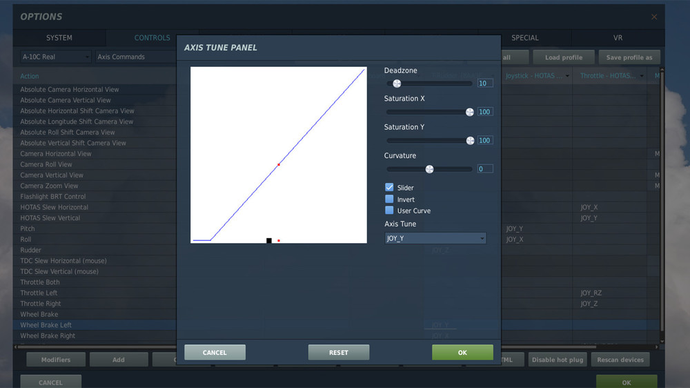 Solved this but left the post in case it helps somebody else. Using R+Ctrl and Enter, I brought up the controller window. Found out that after updating DCS and also "calibrating" my Thrustmaster TFlight rudder pedals, the wheel brakes are always a little bit on! See the attached pics. With the help of Sacarino in a post below, I adjusted some settings in the rudder toe brake control mapping and all's well Moral is: Use the Control Overlay to troubleshoot. Original post as follows: Since updating to DCS Open Beta 2.7.11.21408, all my hogs, A-10A, A-10C and A-10C II won't spool engines up to take off speed. Taking off is impossible, even without any payload and half a tank of fuel. When applying wheel brakes at the start of a take off, the bird doesn't even pull through them. I've checked my wheel brakes haven't somehow become inverted, have ensured airbrakes are retracted and it happens whether skid or no-skid. At Kobuleti, taking off Eastward in zero wind, by the time I get to the last hangar on the right, I'm just starting to get airborne. At Groom Lake, Nevada, I don't even get speed for take off before running out of runway doing 115kts - again, no wind, no payload, flaps at 10 as always. I've mapped keys to throttle and the throttle handles go all the way to the front stop, whether with the keys or my Thrustmaster Warthog HOTAS. I've tried my other aircraft; AH-64 (torque easily goes above 100%), F/A-18C (still gets off the ground nice and quickly). All ok on the Thrustmaster Calibration panel. Have tried other missions; my own and the DCS Quick Start take off missions too (never played these before, was nice to hear Waggs). The hogs all behaved perfectly before the update. Has anybody else had this issue?
