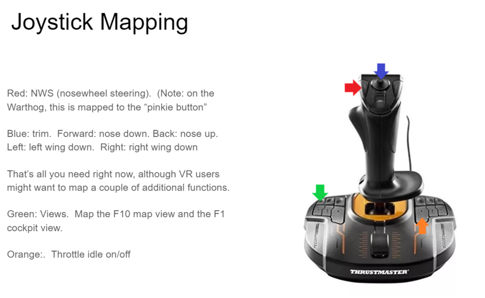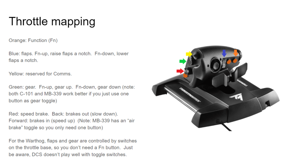 Here's one scheme for setting up functions common to every aircraft. 1. Assign function key. Options - controls - Modifiers - Add. You want to add a "modifier" not a switch. I use the pinkie button on the throttle. 2. On the joystick, assign trim to hat button, NWS to left button, pickle (wpn release) to center button. The right button I usually assign to paddle switch (brakes in eastern bloc jets) 3. On the throttle, starting on the thumb side. Hat switch reserved for comms (including SRS and comm menus). Upper four-way switch: Fn-up = gear up, Fn-down = gear down. Bottom 4-way button: back = speed brake out (slow down). Forward = speed brake in (speed up). 4. On the front. Pinkie button = function/modifier. Two-way switch under middle finger: Fn-up = flaps up. Fn-down = lower flaps one notch. That works for everything. For radar elevation, on the throttle, you will either use the pinkie wheel or the two way switch under your middle finger, depends on the jet (F18 requires the latter). You can use a function button with the joystick hat switch to manage DDI or HUD, depending on the jet. That leaves 8 buttons on the throttle to manage weapons and radar, and several buttons on the base for various things (lights? refuel probe? Views? Idle on/off? Kneeboard?) I've used the slap paddle for various things, it only really words well as designed, ie as a rudder. Never really found a use for the slider on the joystick base, I've used it to control HMD, radar range, and cockpit lighting at various times, with varying degrees of success. When you get it, take it apart, lube it up and set the tension screw just barely right enough to hold it together. It's a great throttle, I've been very happy with it.