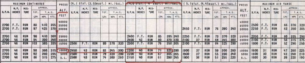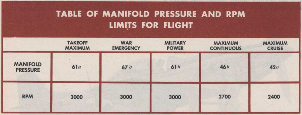 I used military power the whole time except when going around the top of the hammerhead. I wouldn't do that if I were doing a real airshow because that is insane, and it also feels like to get value out of military power you have to be unmaneuvering above 300mph (as weird as that sounds). When I post a more polished attempt at an airshow I'll have figured out a way to manage the engine in a reasonable way for people to imitate and not blow their engine. But of course I would never fly a virtual airshow and not bust out WEP. Even if all I get out of it is to say "WAR EMERGENCY POWER!" But the point of my post is to reply to the question of "What maneuvers will kill a P-51 engine?" And the answer I demonstrated is that you can do all the standard P-51 maneuvers at military power and not blow your engine, AND you can do the hammerhead (that I've never seen an actual P-51 do) as long as you decrease your MPs for a few seconds as you're going over the top. My argument on 3000 RPM is kind of on the philosophy of the engineering of a warbird, and specifically the Mustang. From this chart: Maximum cruise is for operating with the most amount of time between having to rebuild the engine. All the green lines in the Mustang are for maximum cruise. It is normal to be above the green even in maximum continuous because being above the green represents the decrease in the amount of time between engine rebuilds, not that you're going to blow your engine. In war the warbird must get to the fight, and the Mustang is known for having extreme range for a fighter. This engineering trait is represented by this chart: (Those different columns you see are for operating the engine to fly greater ranges). The engine operates from 2700 RPMs and 46 inches at max continuous all the way down to 1500 RPMs at 30 inches. Engineers designed the engine with these needs in mind and the engine settings in the manual here represent that design. Engineers ALSO designed the Mustang to fight a WAR, so there is the setting of 3000 RPM and 61 inches. There is also the EXTRA CRAZY setting of War EMERGENCY Power, which I imagine the engineers had to spend a lot of time considering how to make the engine work with those settings. So warriors need their aircraft to get them to the fight (1500-2700 RPMs) and then they have to FIGHT the fight (3000 RPMs). Why would engineers spend any time thinking about RPMs between 2700 and 3000 and MP between 46 inches and full throttle? My argument is that the Mustang is engineered for fighting at 3000 RPMs and Full Throttle AND that the engineers had experience making engines of war that operated at 3000 RPMs. I don't think the main limitation was from blowing an engine but instead from the fact that if everyone in your squadron is using military power and WEP all the time then you are going to be spending a lot of time rebuilding engines rather than fighting the war. This is also probably why modern pilots fly their Mustangs at or below maximum continuous; they don't have a crew of mechanics rebuilding their engine between airshows. The main limitation of the engine in my mind is speed, not RPMs. As long as you're going fast you're "fine." (although obviously there are many caveats) -