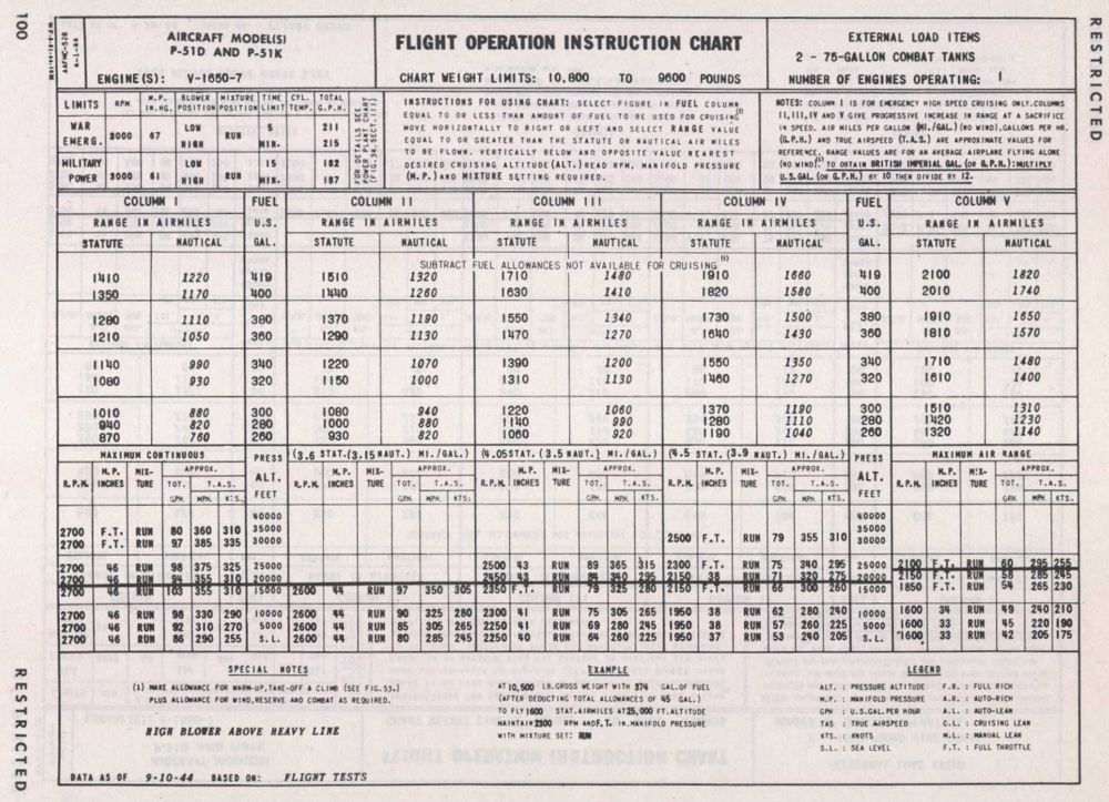 I've done some endurance flying the the Mustang. You have to configure your engine for distance rather than speed. So lower MP and RPMs. Also flying at the correct altitude is important. Here is a chart to use for 75gal wingtanks: You can see, for example, in Column I at "max continuous" (2700RPM at 46MP) at 20,000 ft with Hi Blower ON, the Mustang will run at 94 gallons per hour at 355mph TAS according to the chart. In Column V at 2150RPM and Full Throttle at 20,000 ft with the Hi Blower OFF the Mustang will use 58 Gallons per hour at 285mph TAS. So with this chart you can plan for any mission in the range of the Mustang and get to your IP with the amount of fuel you want at the time you want as fast as or as fuel efficient as you want.