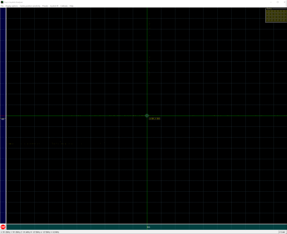 When moving the stick while watching the the Cougar Viewer or Foxy Analyzer, the stick doesn't accurately register movement in any direction. I've attached a screenshot of the Foxy Analyzer for reference, and only pushed the stick in each cardinal direction once. Pushing the stick left gets the most response, but still droops down on the Y axis, pushing right often causes detection to the left before bouncing to the right, and pulling back on the stick registers almost nothing on the Y axis unless I hold it.