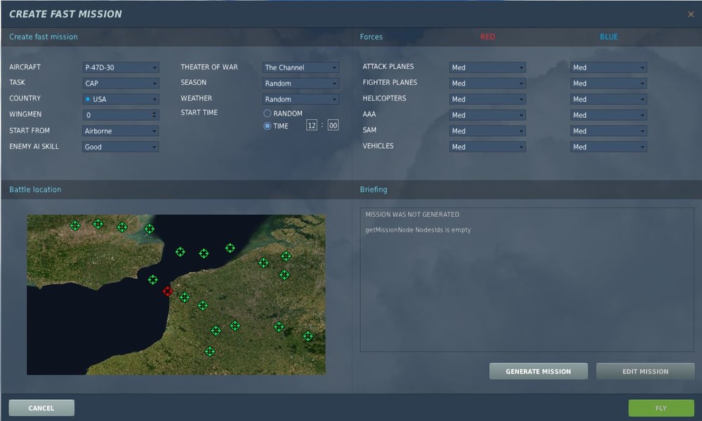 Channel Map problem : I can fly (the 3 supplied) missions on it, also Instant Action missions, but I can not create Quick missions (Advanced or otherwise). I always get -after I try to generate a mission- error message “getMissionNode Nodeslds is empty”. I only get this with the New Channel Map … I tried to ‘repair’ my OpenBeta install but it does not help any… Early Acces problem !? Please help … can other people generate Quick Missions ? (BTW other maps are still OK in this respect) Thanks, :helpsmilie: