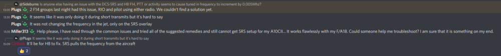 I am also having the frequency hop issue, observed in an MP session with two full crew F14B and AV8b on server with latest DCS-SRS. Radio frequency was indicated correctly in each cockpit but SRS showed a 0.005Mhz frequency hop. Unable to find a work around at this point, unsure if it is a random, time bound or activity bound uncommanded frequency increment, but I would guess it it is to do with PTT presses. Edit: From the DCS-SRS discord -