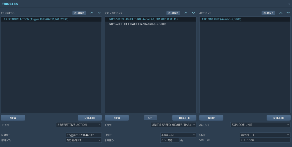 This is not quite the only way to get rid of the speed exploit, but I suspect you will still argue for restricted weapons after a solution/patch regardless. @Alpenwolf it is more work for you unfortunately but you could setup a trigger for each Viggen unit in mission to explode if it exceeds a specified speed below a specified height. This doesn't appear to require a trigger zone to be defined. No idea of performance impact for a server wide application of triggers for each Viggen. In the below example if the specified unit, a Viggen, is below 1000 (appears to be in meters) and exceeds 755knts (mixing of imperial and metric units, great), about 1400kph, it will make the specified aircraft explode. I have no idea what the explode unit "volume" parameter means, i.e. no idea if 1000 is large or small, perhaps it is too large and might take out other nearby units. Also note trigger type repetitive action for slots that can be retaken to ensure this fix is persistent. Just an idea to "rough fix" the Viggen overspeed bug in the absence of or until an official fix from Heatblur. Might be worth putting a warning in the briefing if you do this though or it could piss people off. But at the moment the restricted Viggen weaponry is also an annoyance for players.