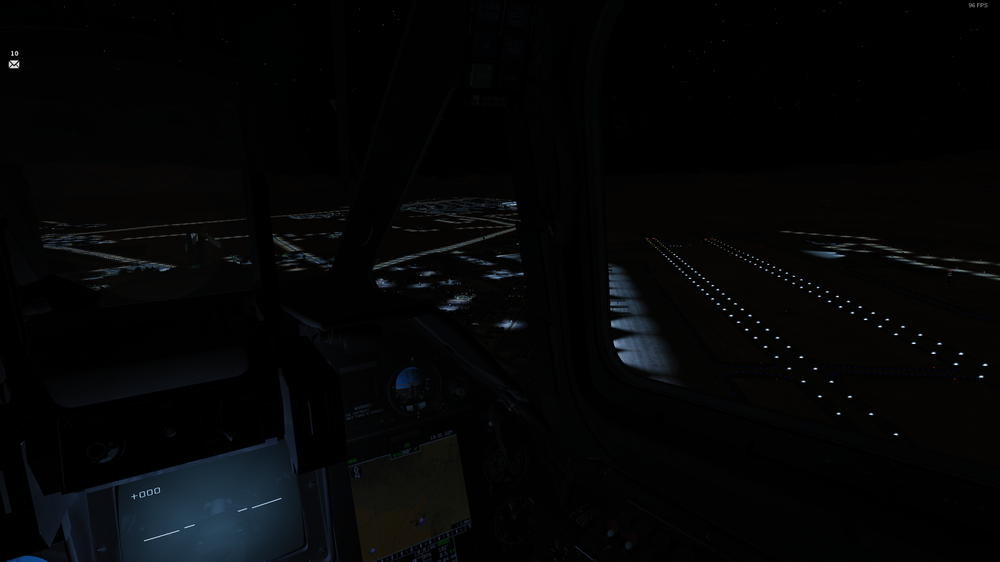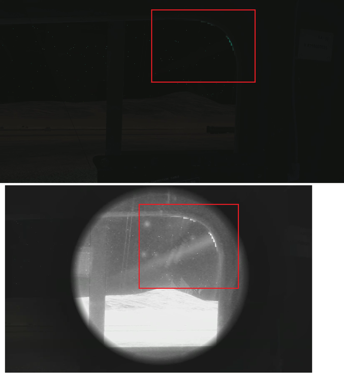 Window edges are showing pixelated edges from outside lights. It can be replicated with NAV lights, other lights being on or off did not change the outcome. Easily visible on the top and side windows, especially with Night vision goggles on. this instance is on the Nevada map, 2am flight, english cockpit.