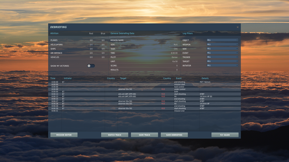 I was writing a script that duplicates groups and found out that if you add a group using the addGroup Lua function, it breaks the debriefing screen in following ways: 1) The new group will have no country. In attached screenshot, the country should be USA but the field is empty. And yes, all the referenced countries are in coalitions. 2) The new unit will be named after its ID, not its name. In attached screenshot, the name should be "new unit", but instead it shows ID of 67. This ID of 67 is assigned by me and if you leave it unassigned, it will display an autogenerated ID (1000000 and higher). 3) The screen sometimes shows events from previous sessions before the mission start event. It appears memory is not properly cleaned up, which might be dangerous for stability of the game. I did actually have a DCS crash while writing my script, altough it might be unrelated. messed_up_debriefing2.trk x.miz