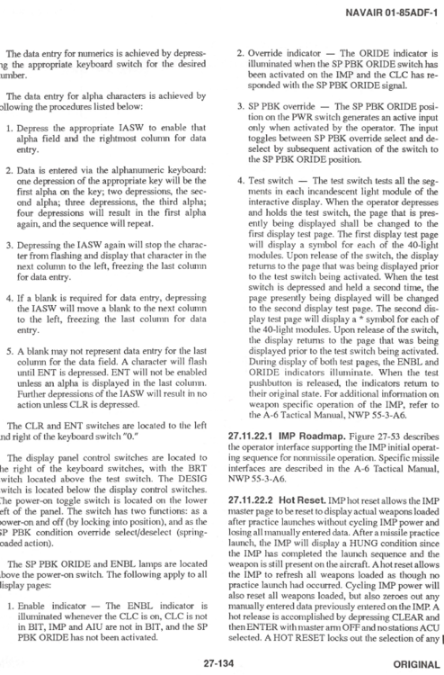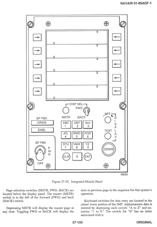 yes, with the WCSI upgrade the A-6 got 1 digital panel to control Harpoons the ability of that panel was enhanced with the SWIP here a photo of a A-6E SWIPs missile panel where 1 HARPOON is loaded: after selecting that harpoon the symbology change: as you see its not a MFD like on modern jets, its a really basic computer interface with the screen being literally just 5 lines from a digital clock XD here the description of that panel from the flight manual: the panel is needed to deliver weapons like the maverick, walleye, harpoon, SLAM or HARM specially note that this panel enables the A-6E SWIP to make use of the HARM SP pullback (shoot at radar emiters behind the plane) -