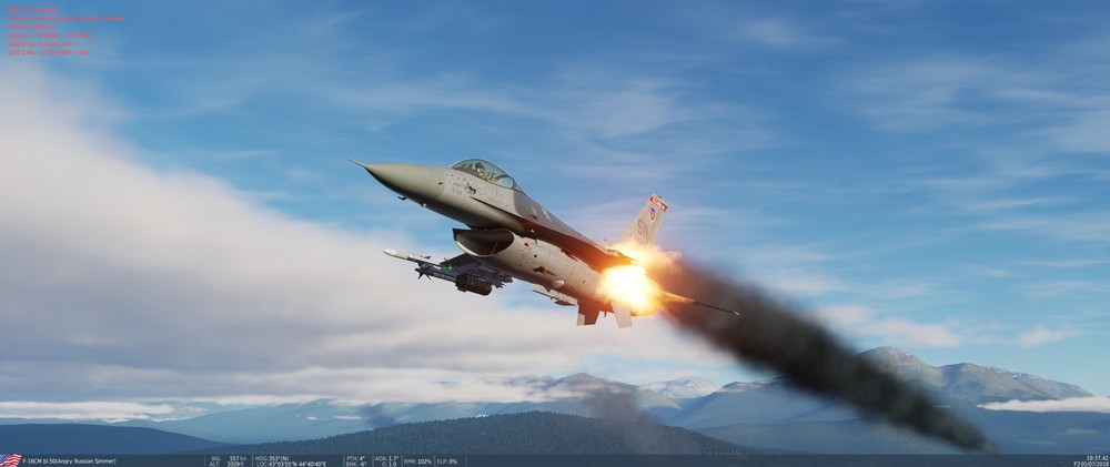 Вот еще. Увы, забыл трек сохранить, но суть. Подбили из ПЗРК. Самолёт с карты исчез, но продолжил лететь и управляться более или менее. А спустя минут 10 кружений относительно мягко сел Офф-лайн, миссия от самого модуля "Close Air Support". Зовите меня Топпер Харли или «Пушистая кроличья лапка»