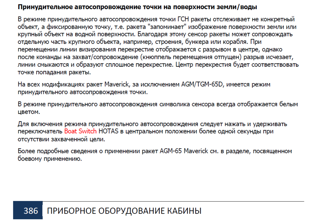 Ну вот! И Вы тоже не знаете видимо об этом. Если у Вас есть РУД ХОТАС то попробуйте нажать на Boat Switch в среднем положении. И он нажмется со щелчком. И тоже самое можете проделать с China Hat в среднем положении. То есть нажать на China Hat. И China Hat нажмется. Вот идите и попробуйте! У Boat Switch это нажатие в среднем положении переключает наведение маверика не по конкретной цели, а по тому месту земли на котором стоит неподвижная цель. И соответственно тогда можно пулять Мавериком не дожидаясь максимально возможной дальности стрельбы мавериком. Привожу ниже текст с родного мануала к А-10С. Страница 386: