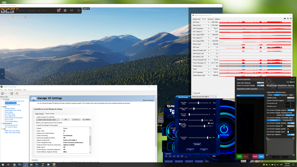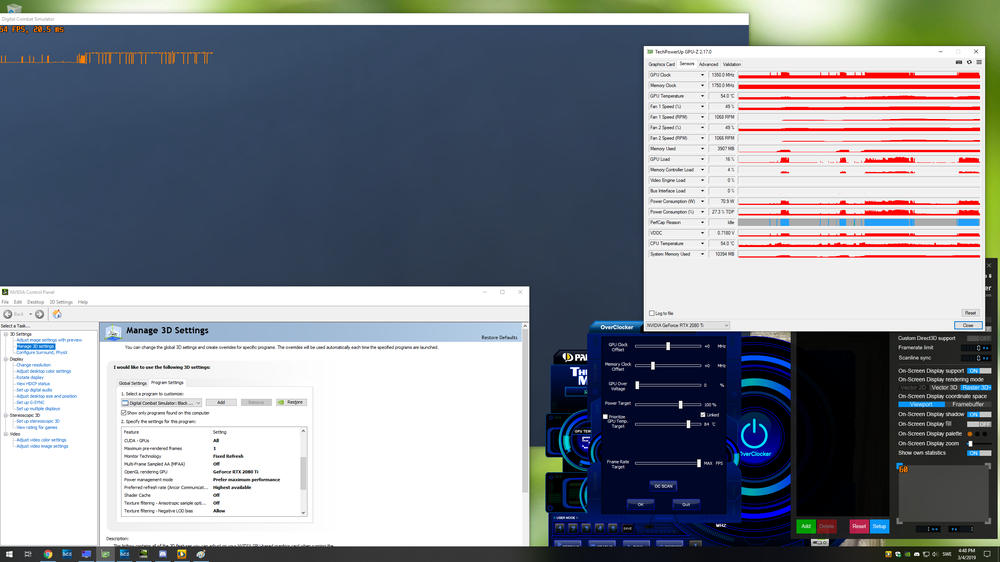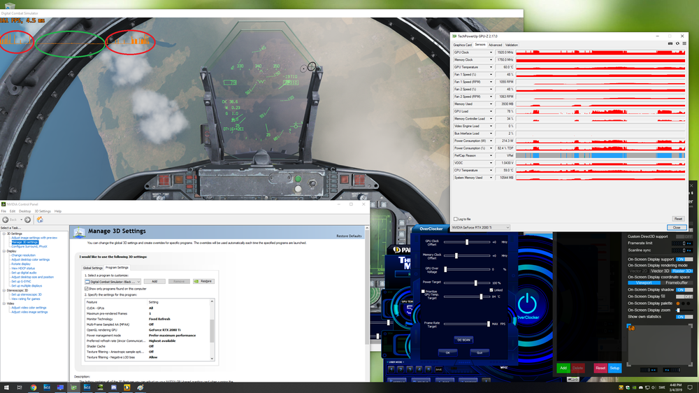 My 2080ti does the same quite often, and I have yet to figure out what is the cause. I have verified with gpu-z that indeed it sometimes goes to idle in DCS! No idea why. I thought I was the only one... But apparently I am not, and this isn't a single user case. My system is 9900k, 32 GB ram, Palit 2080ti gamingpro OC. What about you? This is on a fresh windows installation! (yesterday) with zero usb input devices attached except mouse and keyboard Setting the card to "prefer max perf" has absolutely no effect on the issue. Screenshots attached Flapping idle/full perf in game Idle in menus: Idle looking at sky: