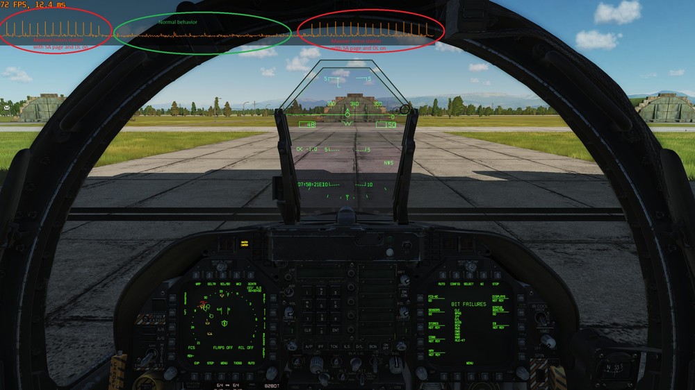 Reproducible: 100% on my computer Date: 2018-03-01 2200Z Sim version: 2.5.4.28090 Open Beta Mission: Any mission where there are targets on the network (donating yourself is enough to trigger the issue), First discovered on Caucasus Blue Flag Server MP server Steps to reproduce: 1. Enter mission 2. Start up F-18 3. Everything works works fine (about 70 fps) on ground... until 4. Turn on DL + Open SA page. 5. Microstutter from hell :(. Unplayable. See attached frame time graph. 6. Exit SA page and microstutter totally disappears (see frame time graph) Problem: I cannot play in missions that my squad mates play in if I turn on SA page with DL. I get massive microstuttering. My friends dont have this issue, so I dont really know what to do Later also had a squad mate measure frame time and he does not have the issue (verified with measurement) tried repairing my DCS installation but it didnt help. The green "Normal Behavior" part of the graph below is when I do not show the SA page. The red part of the graph below is when I show the SA page. Track: MP track too big to attach. Attaching single player track instead Screenshots: Screenshot with frame times attached Screenshot with ingame graphics settings attached (but later discovered graphics settings dont affect the issue) Desired solution: Figure out why I cannot use SA page :( SP/MP: I first discovered this in Multiplayer, but later measured and exactly the same issue is present in single player. System spec: 9900k 32 GB ram @ 3466 MHz 2080Ti dxdiag attached DxDiag.txt microstutter with sa page.trk