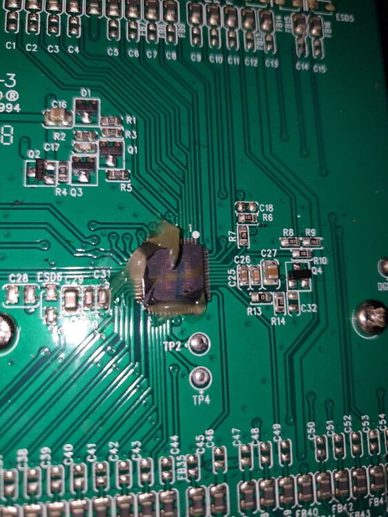 Решел проблему так: На плате РУДа есть чип (см. фото). Нанес немного флюса и прогрел чип по периметру паяльным феном. Важно: греть нужно ровно столько, чтобы припой на ножках слегка "освежился", не перегревая сам чип.