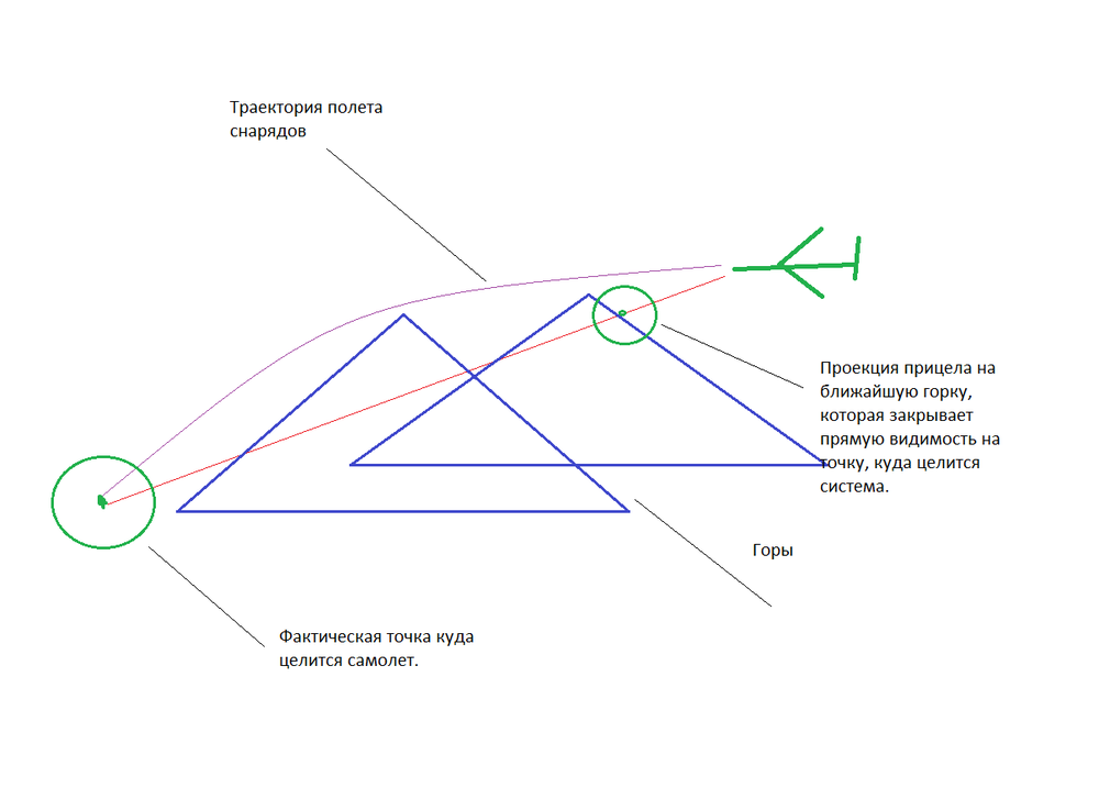 Не-не, на видео проблема в другом. Вы загоняете баллистический вычислитель пушки в пограничное состояние. Помним, что снаряды летят по баллистической траектории, и вылетают они относительно HUD-а где-то в районе DERP-а с СГФом. И потом начинают падать и тормозиться, а после встречаются с точкой поверхности, на которою наложен прицел при стрельбе. У вас получается, что снаряды пролетают выше склона, в который, как вам кажется, вы целитесь. Соответственно, слишком умный самолет начинает показывать вам прицел не на видимом склоне, а на том, что закрыт для прямой видимости. Об этом сигнализирует так же дальность до цели, которая индицируется под прицелом. Он у вас целится, в среднем, на 4 мили, в то время как склоны от вас - в километре. Я попробовал набросать схематичный рисуночек, который показывает, что происходит. Только не надо ржать над моим иллюстраторским талантом :- Чтобы прицел так не глючило, надо строить заходы чуть покруче, чтобы у самолета не было сомнений, куда именно вы собираетесь стрелять. Ну, если цель не Абрамсы, и они не штурмуют сопку с углом набора высоты в 45 градусов, то ошибка в пару десятков футов высоты не так уж страшна. Можно просто поставить маркпоинт с упреждением в ту точку, где цель будет к моменту начала атаки. Вообще, ошибка прицеливания при неправильной поправке на скорость цели будет выше, чем на поправку по высоте. Так что бросание чугуния в горах, да по движущимся целям - та еще задачка. А если еще ветер добавить. Тут великий "Гефест" нуно. А А-10 для этого маверики с CBU носит. -