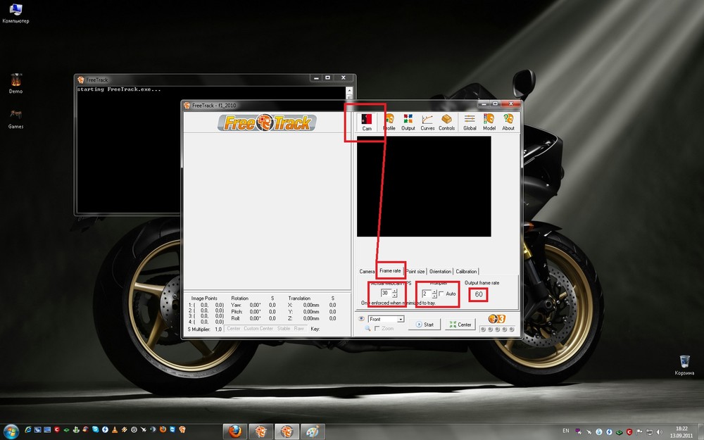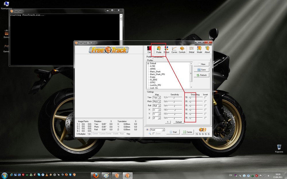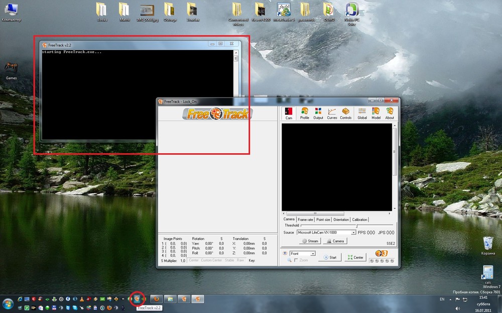 Перед тем как проводить операции с FreeTrack в игре были заменены файлы папки bin отсюда: http://files.digitalcombatsimulator.com/ru/84728/ Далее распакованы файлы утилитки как показано на рисунке 1 и 2. Затем изменены свойства ярлыка FT (у меня ярлык помещен в быстрый запуск). Это показано на рис. 3. На рис. 4 показано, что вы должны получить после запуска модифицированного ярлыка. Внимание. В настройках игры устройство трекинга отображаться не будет! Все настройки необходимо производить только посредством FT. В настройках FT включены оба интерфейса, как TIR так и FT.