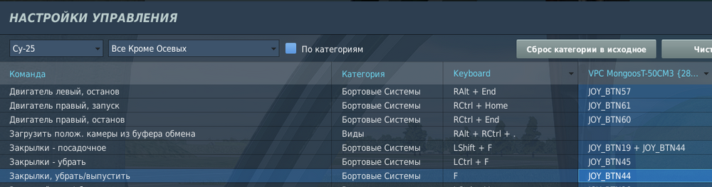 Это понятно... меня интересует ФИКСИРУЕТСЯ ли переключатель в крайних положениях. Поясню... Я использую VPC MongoosT-50CM3 Throttle, и там нет "чистого" трёх-позиционника (с фиксацией в трёх положениях). Зато есть три переключателя ON-OFF-ON с возвратом в центр. Так вот на таких переключателях Ваша метода не работает(. Хотя за наводку спасибо! Я у себя реализовал управление закрылками через модификатор То же самое на Су-25Т. Су-27 и Су-33 имеют только два положения закрылков, а вот на МиГ-29 в кокпите на блоке управления закрылками кнопочка "ВЗЛЕТ" имеется, а заставить её работать не получилось(... возможно баг.