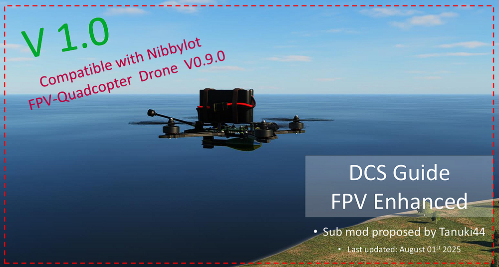 FPV Drone Enhanced v1.0 https://drive.google.com/drive/folders/13VJttIrcidAznYCtfpsBNSd94VLmXA-8?usp=sharing Prerequisites: The Mod of Nibbylot FPV Quadcopter Drone [V0.9.0 Beta] Add HUD with vertical view for dropping, available in 3 colors (white, black, green) Add 'LOW Battery' alert if <= 10%, red flashing Add Toggle keybind for Acro/Angle mode Add Camera View inclinable 0 to -90° (keybind Num2 & Num8) and instant droppable view (SnapView 2) Add 3x ammunitions droppable Add SunVisor Add NVG view See Settings for other Keybind Improved ground stability The angle mode is selected by default, camera tilted downwards at startup Advice At start, the engines must be started with the lowest power level. Zip archive is OVGME compatible Known issue : To limit destruction to starting on the ground, the collisions are restricted ... Thanks to Bearcat for writing the doc, and the creation of the 4 missions which are integrated into the submod. Have fun ... -